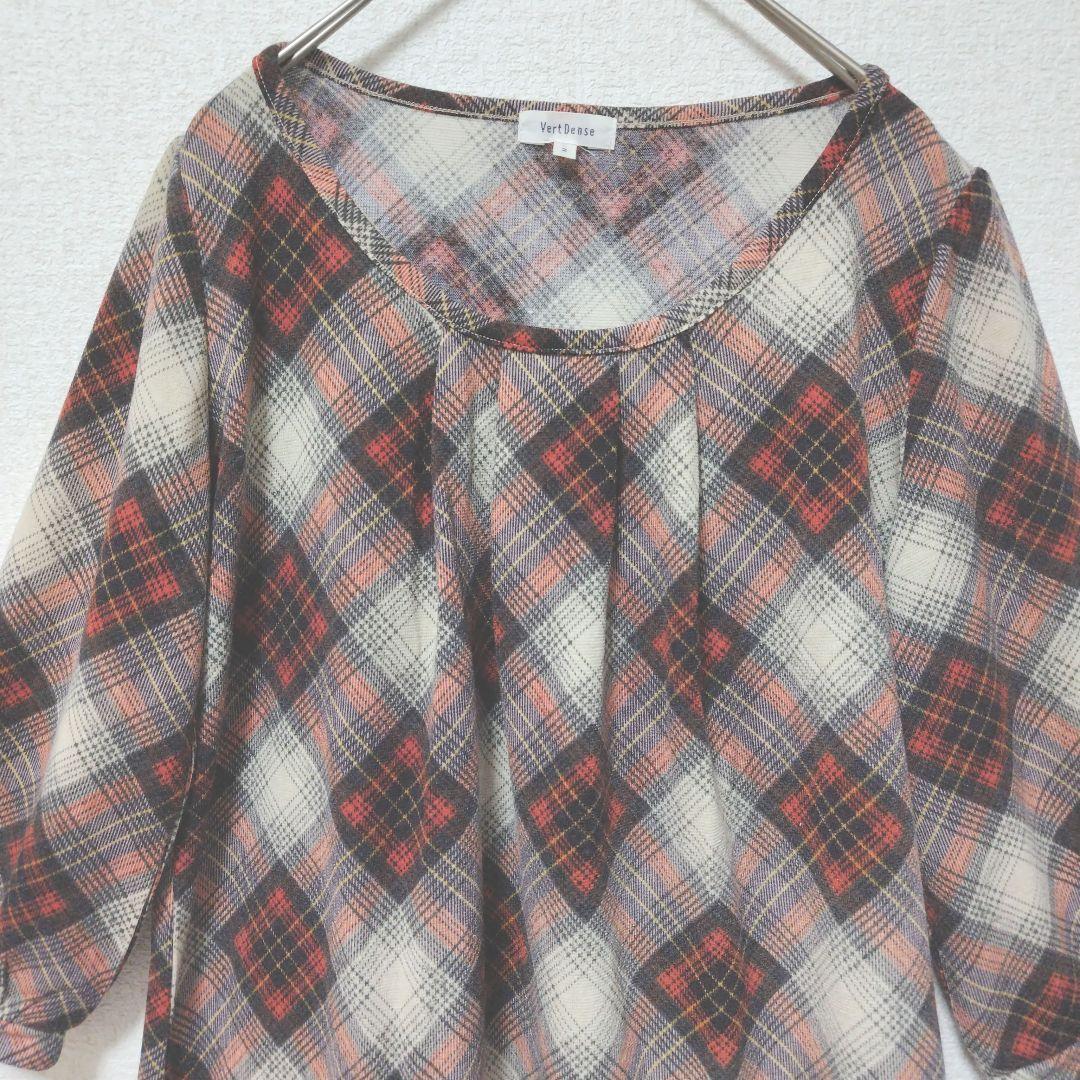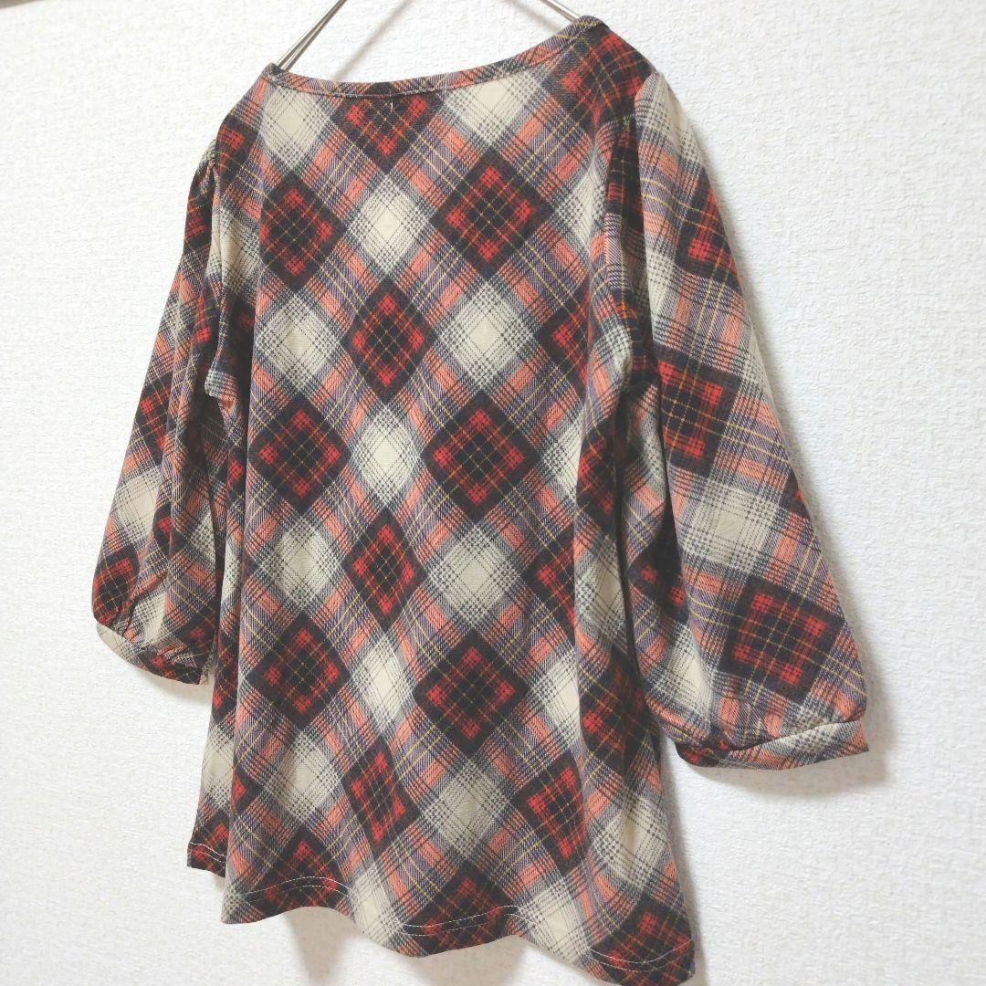 ベージュ地にオレンジ、グレー、紺のチェック柄の七分袖チュニックです。