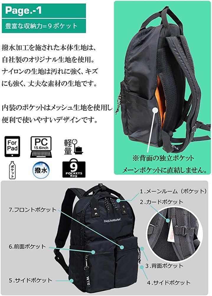 【ポケット説明】・正面ポケット✖2・サイドポケット✖2・ショルダーカードポケット✖1・背面ポケット(独立ポケット)・内装にはPCサイズの仕切りメッシュポケット✖1 ファスナーメッシュポケット✖1