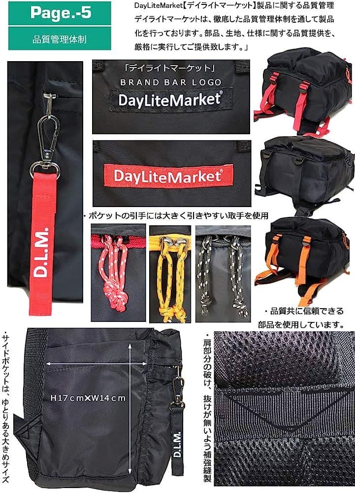 【メイン素材】・表生地 ナイロン(撥水加工)・内装生地 ポリエステル(オレンジ色) 【本体サイズ】・縦 約42cm、横 約29cm、幅14cm 約17L