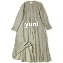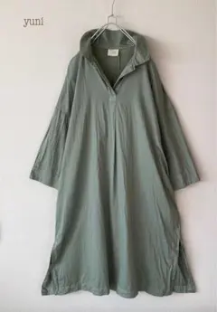 落ち着いたカーキカラーに、ウエスト部分の細かなプリーツデザインが印象的な一着。ウエストには共布リボンが付いており、シルエットの調整も可能です。