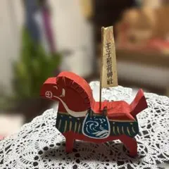 藁で作られた装飾的な馬の工芸品、赤と白の色合いが特徴。