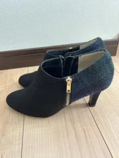 スエードとツイード素材のグレーのブーティ、ジッパー付きでスタイリッシュ。