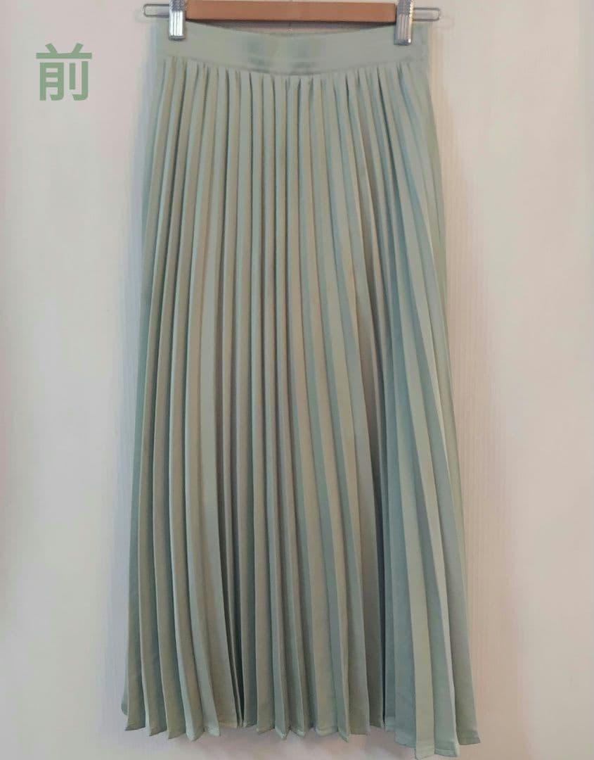 軽やかなミントグリーンのプリーツロングスカート、伸縮性のあるウエストバンドで快適な着用感。