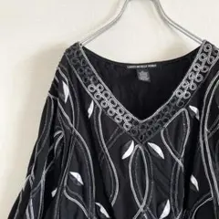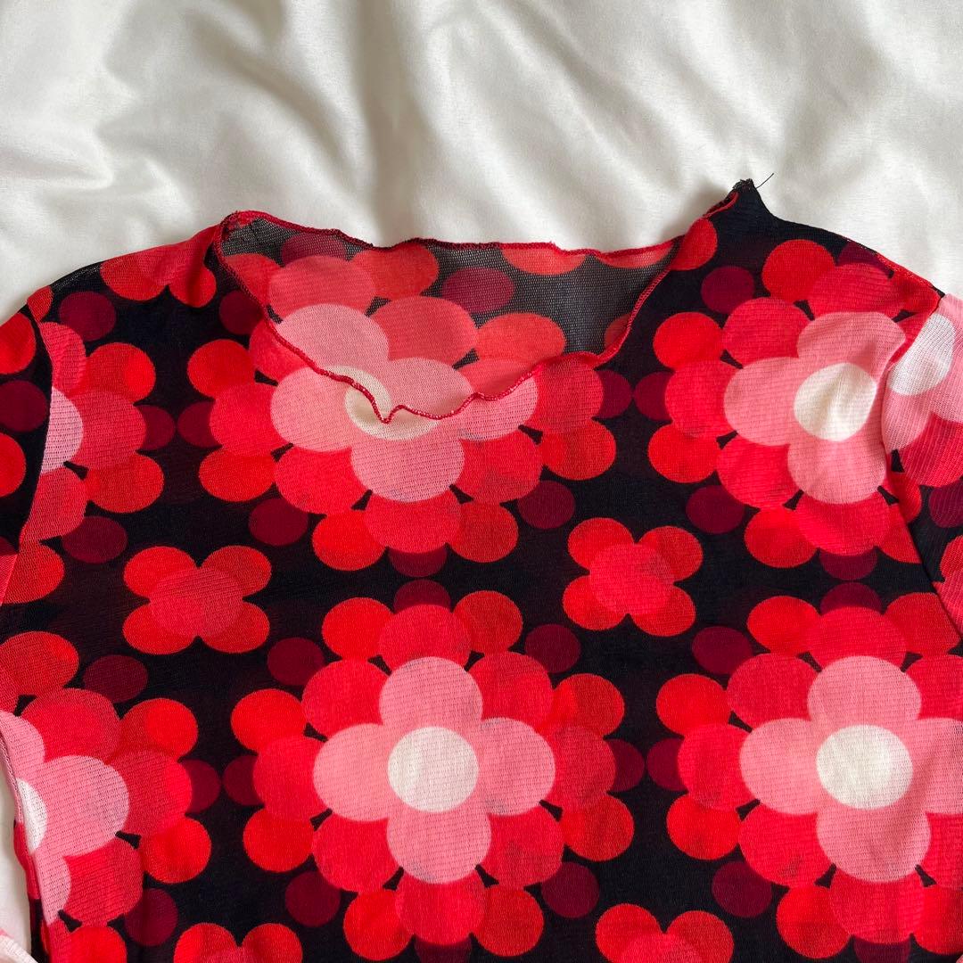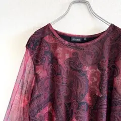 赤と黒の花柄デザインの長袖トップス、薄手で軽やか。