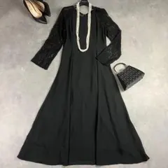 見映えする大きいパネル柄レースを全体に使用し、ウエストは格子柄のはしごレースで切り替えたミディ丈ドレス。