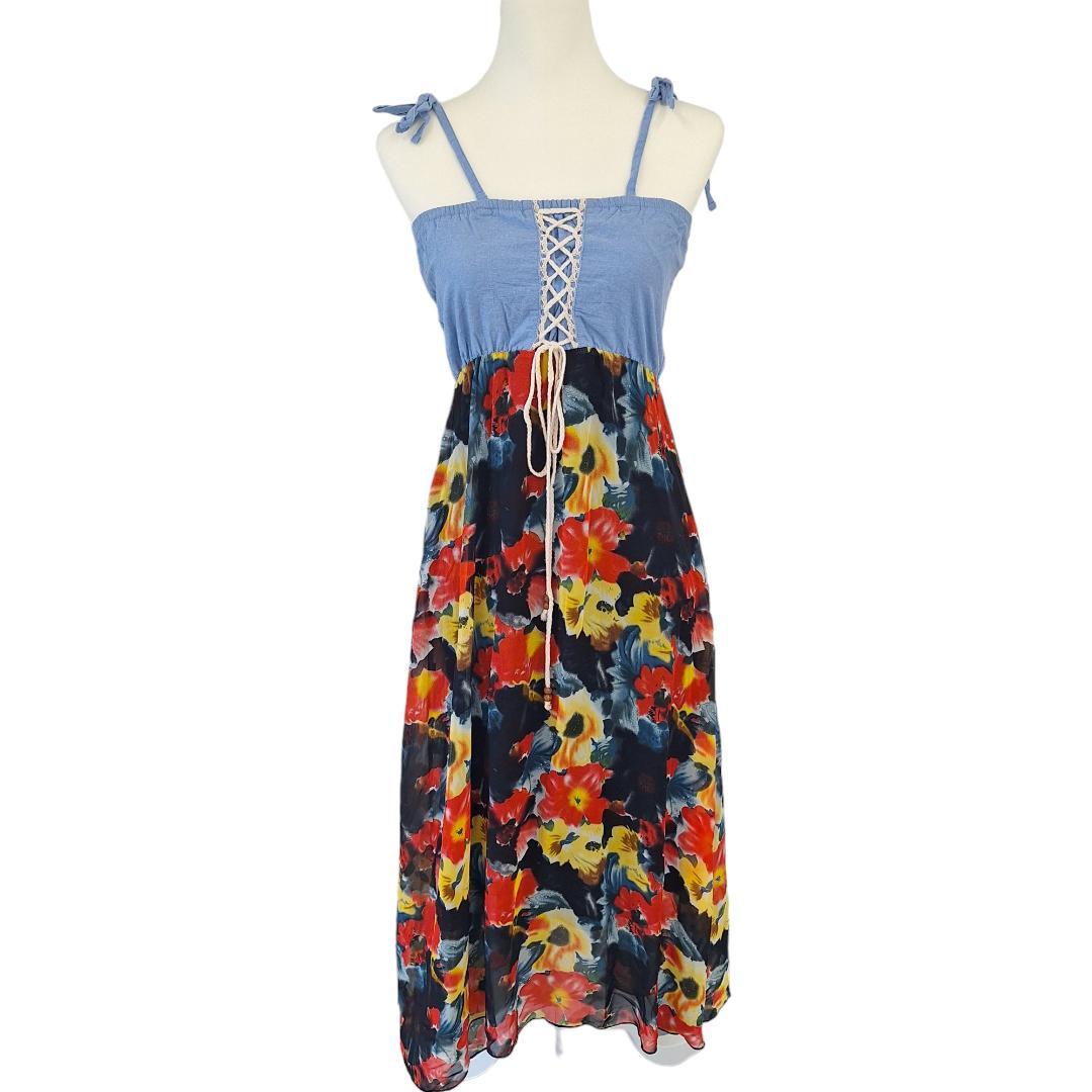 ベアトップ部分は爽やかなブルー、スカート部分は黒ベースの花柄の2カラーになっています。スカートはシフォン生地でふわっとした印象で、ビーチやリゾートシーンでも活躍しそうです。肩ひもは取り外し可能です。