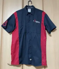 ドット柄の赤と白の半袖シャツ、刺繍入り。