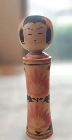伝統的な木製こけし人形、花模様と赤い髪飾りが特徴。