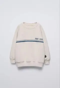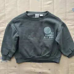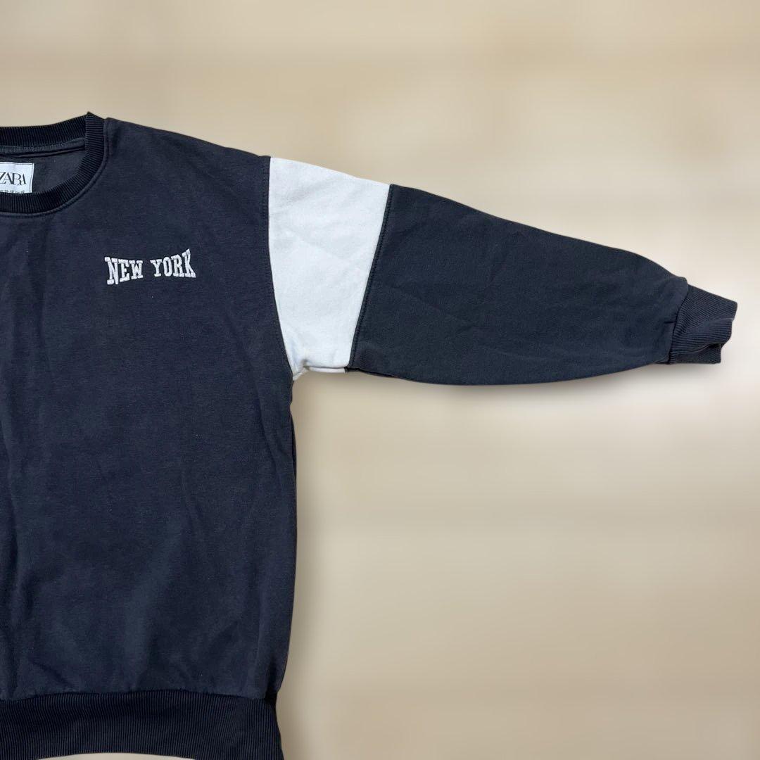 ZARAキッズの裏起毛スウェット。チャコールグレー×ホワイト。左胸と左袖にワンポイントと背面に刺繍のロゴデザイン。よく見ないとわからないレベルですが、裾のリブ部分に若干色褪せがあるようにも見えるのでご承知おきください。その他目立つ傷、汚れはありません。