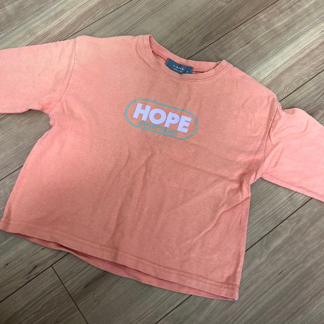 HOPE EVERYTHINGプリントのピンクオレンジ色の長袖カットソー。