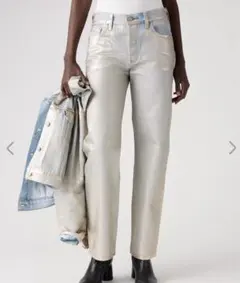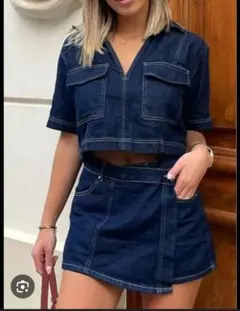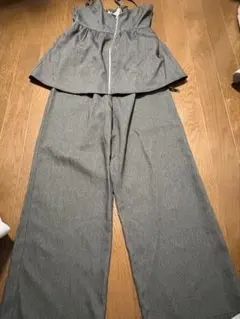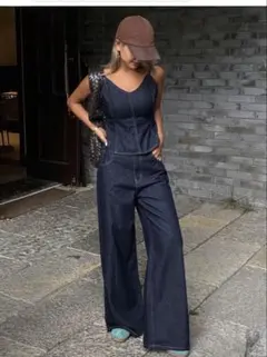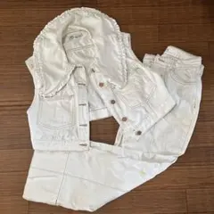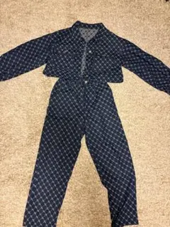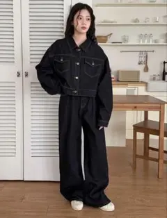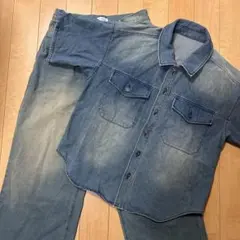 スリムなシルエットが特徴的なシングルブレストのジャケットと、パンツのデニムセットアップです。