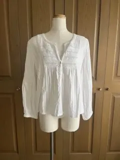 胸元のフリル部分が可愛らしく、ボリュームのある袖が魅力的です。さらっとした素材感で華やかな印象をあたえます。