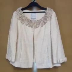 花柄のツイード素材を使用した、ゴールドボタン付きのケープコート。