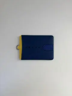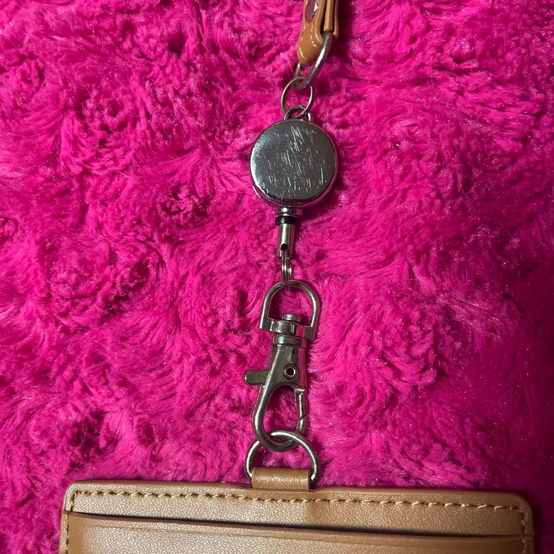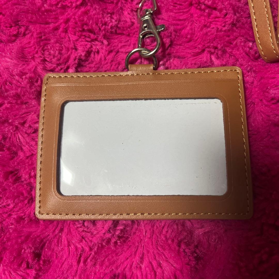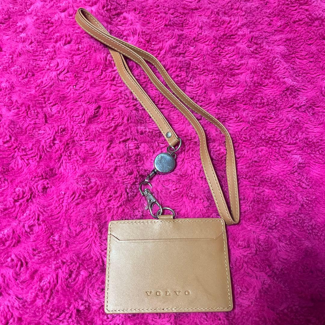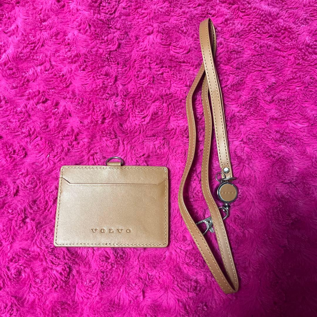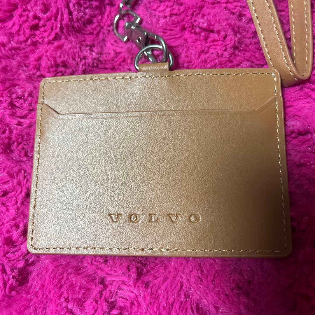VOLVOのベージュ合成皮革パスケース、IDカード用透明ポケット付きで、調整可能なストラップが便利。