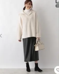フロントはシンプルなVネックですが、バックに深めのスリットが入っており、レイヤードスタイル(重ね着)を楽しめるデザイン性の高い一着です。
