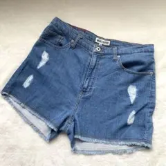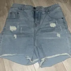 ホワイトのハイライズショートパンツ、ボタンフライとダメージ加工が特徴。
