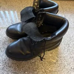 スエード素材の黒いワークブーツ、オレンジのライニングが特徴。