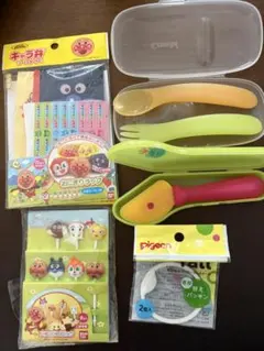 アンパンマンのデザインが施されたグリーンのスプーンフォークセット。