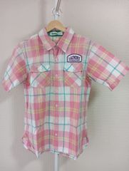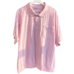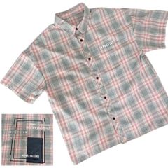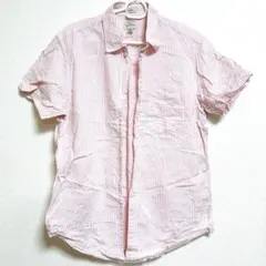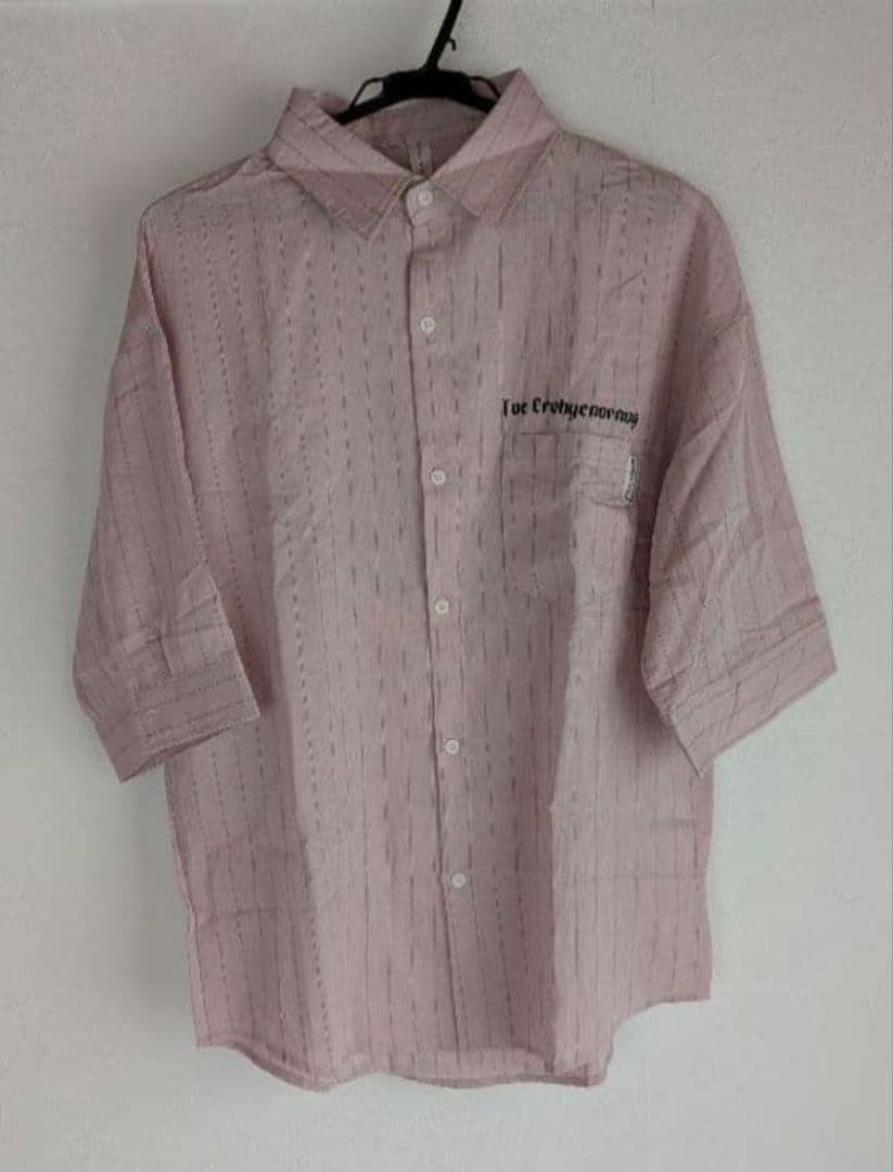 淡いピンクと白の繊細なストライプが特徴の5分袖シャツです。