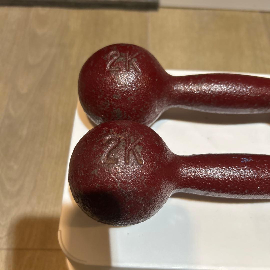 2kgのバーガンディダンベル、鉄製で耐久性あり。