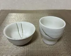 ご覧いただきありがとうございます。長期在庫品ですので、それを承知ください。一風変わった盃です。左側の盃は横に少し凸があります。写真⑩ 寸法 口径5cm 高さ3.5cm 茶托 口径6.5cm高さ1.5cm 素人採寸ですので、あしからず。2個の価格です。専用箱はありません。煎茶にも使えます。