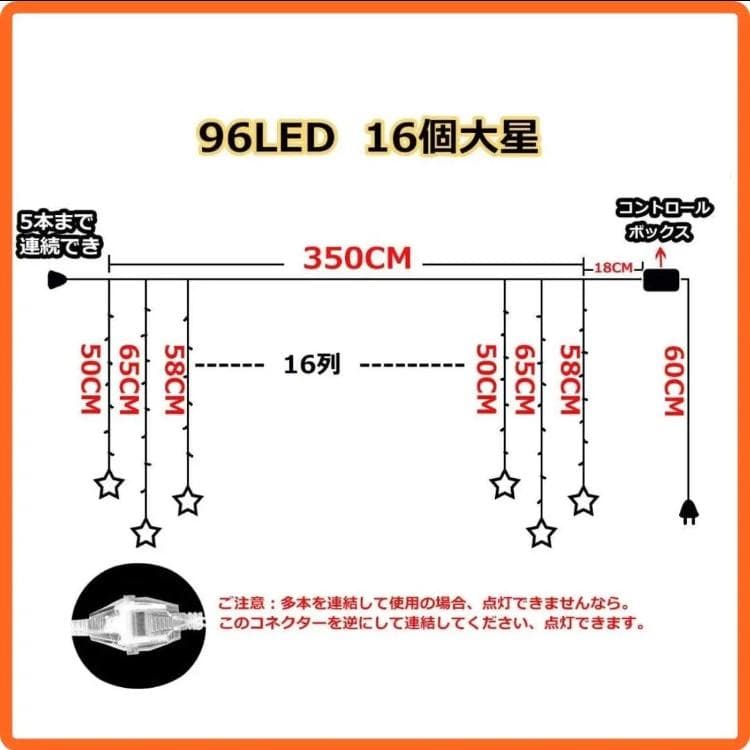 LED: 96球のLED電球が等間隔に配置され、裾には星型のLEDライトが16個ついています。(星の直径は約6cmです)