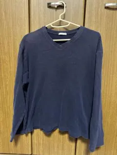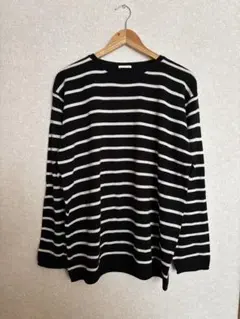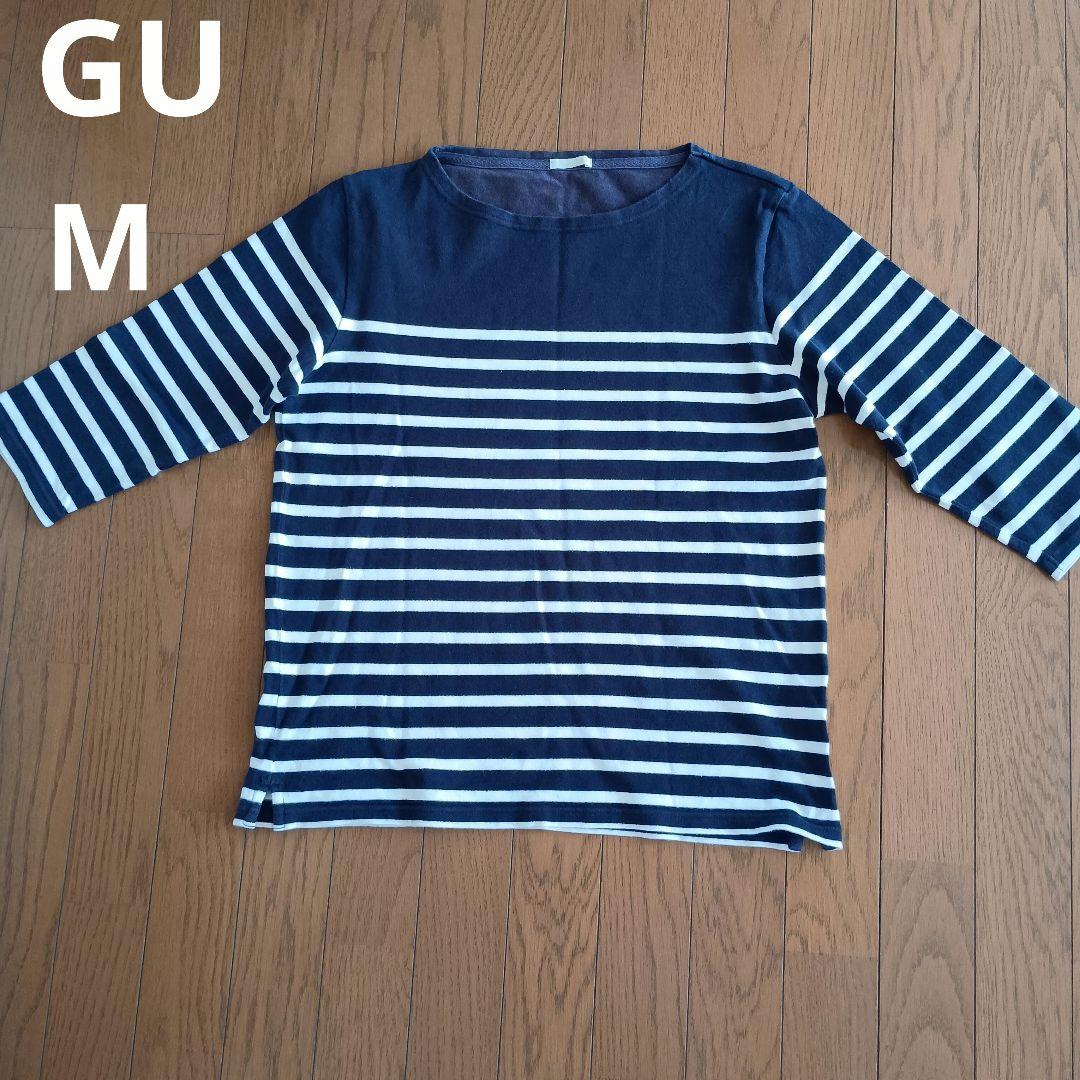 ネイビーとホワイトのボーダーデザインの七分袖Tシャツ、サイズM。