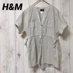 アイボリーのボタン付き半袖シャツ、サイドスリット入りでリネン風素材。