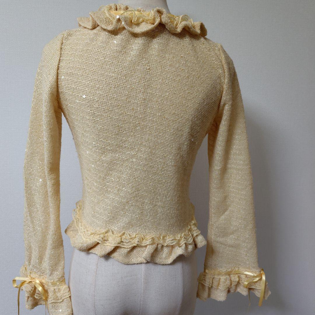 BODY LINE製、リルとリボンが特徴のベージュ系クリーム色ニットカーディガンになります。