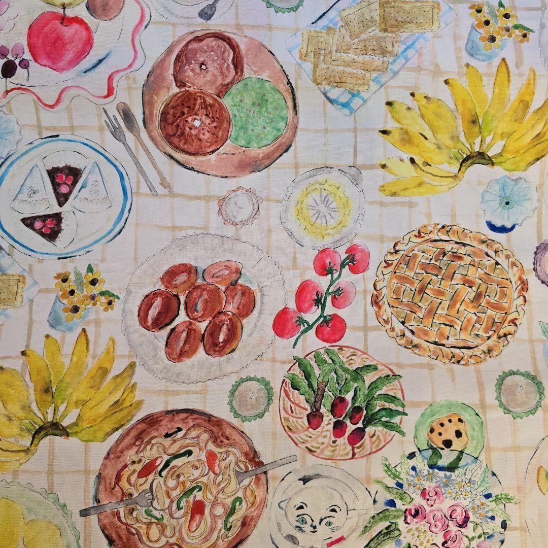おいしそうな色とりどりの料理と季節のフルーツが描かれた「テーブルの上」