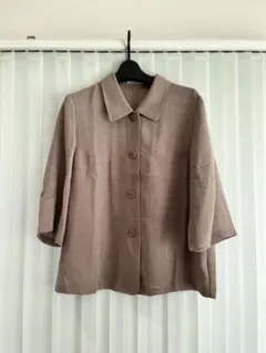 ダークグレーのボタン付きカジュアルジャケット、長袖で襟付きのデザイン。