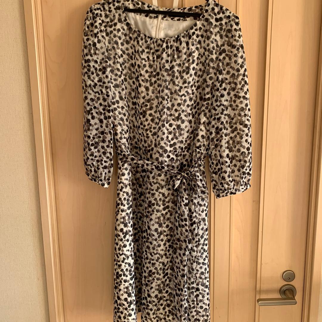 ヒョウ柄の七分袖ひざ丈ワンピース、リボン付きベルト付き。