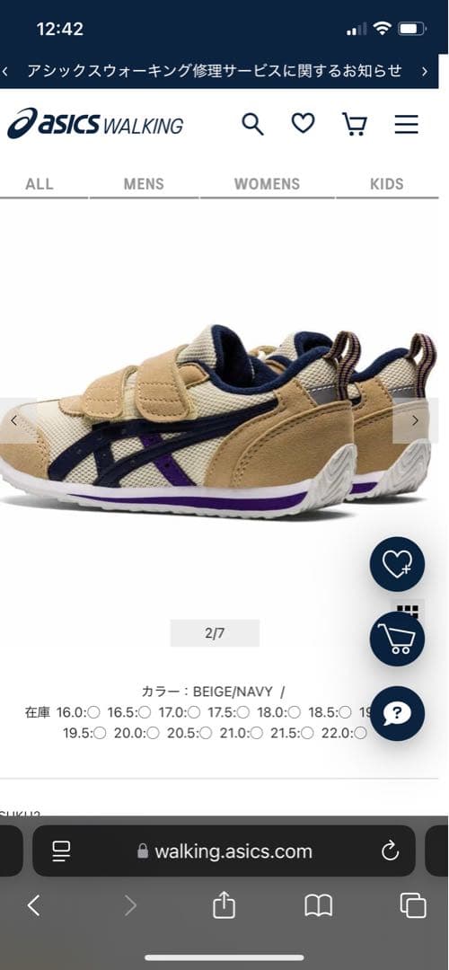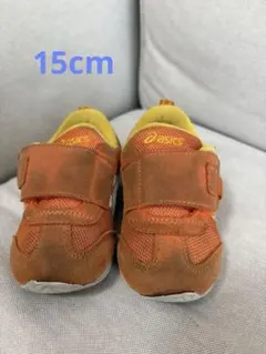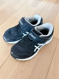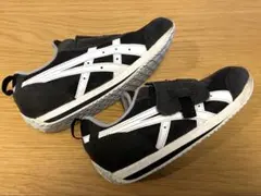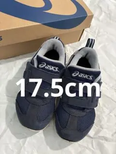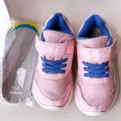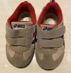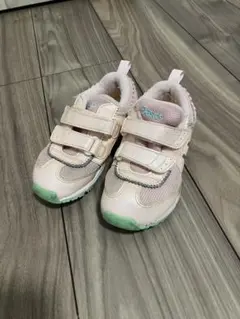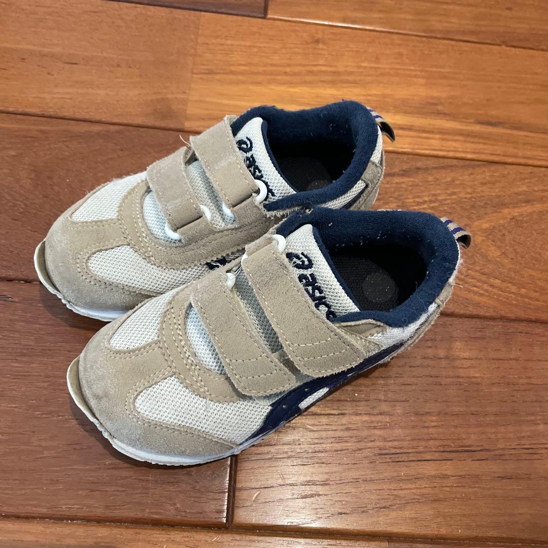 ベージュとネイビーのスニーカー、ベルクロ留めで履きやすいデザインです。サイズは17センチです。