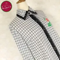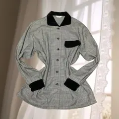 美品 昭和レトロ総柄シャツ 千鳥格子ゴールドボタン オープンカラー レトロポップ