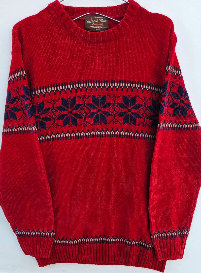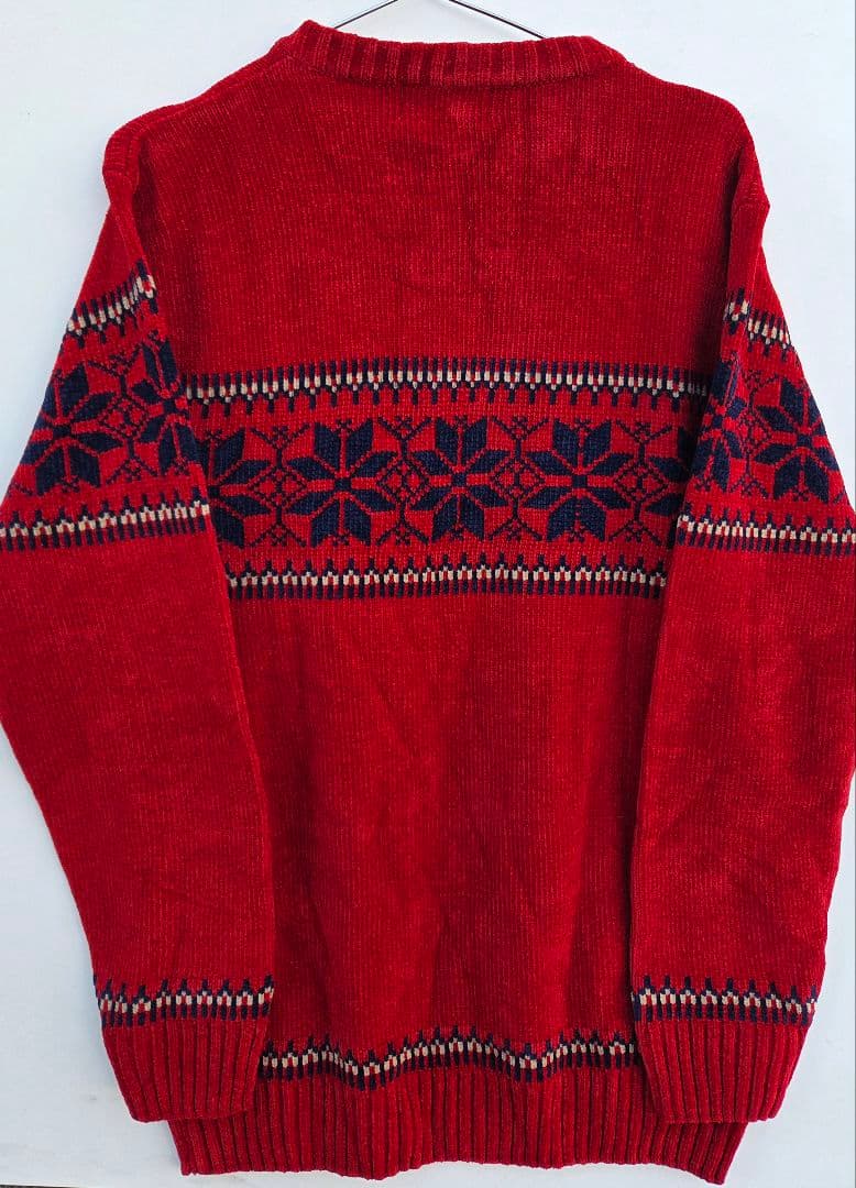 ウール混紡の赤いクルーネックセーター、雪の結晶柄が特徴。