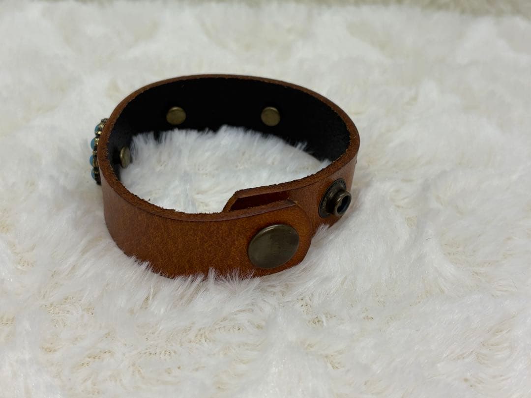青い花の装飾が施されたブラウンレザーのブレスレット。