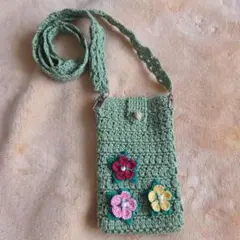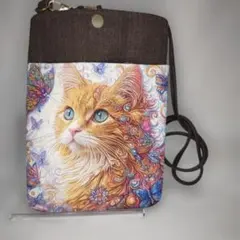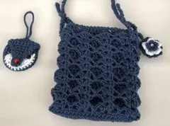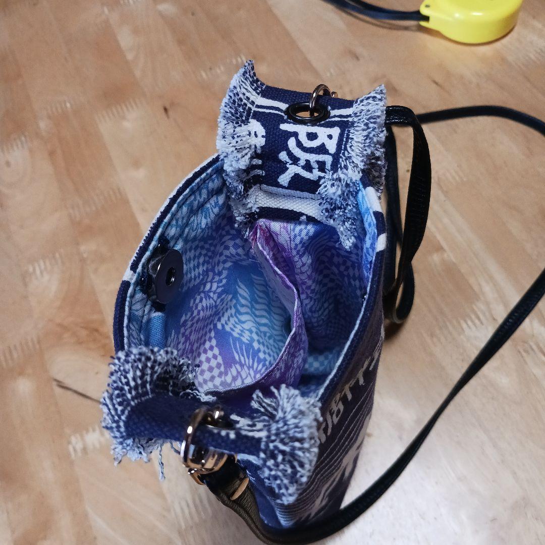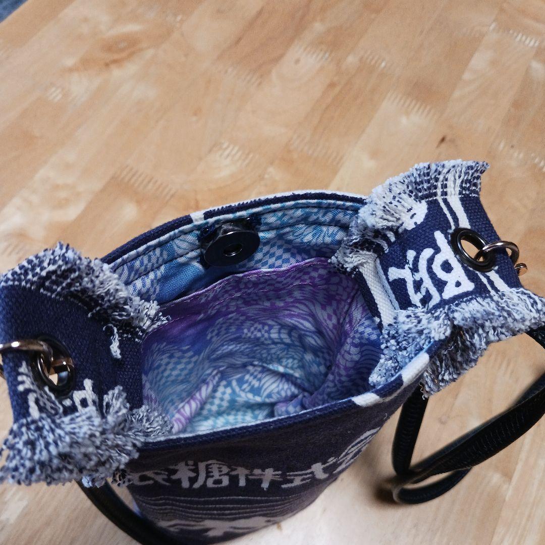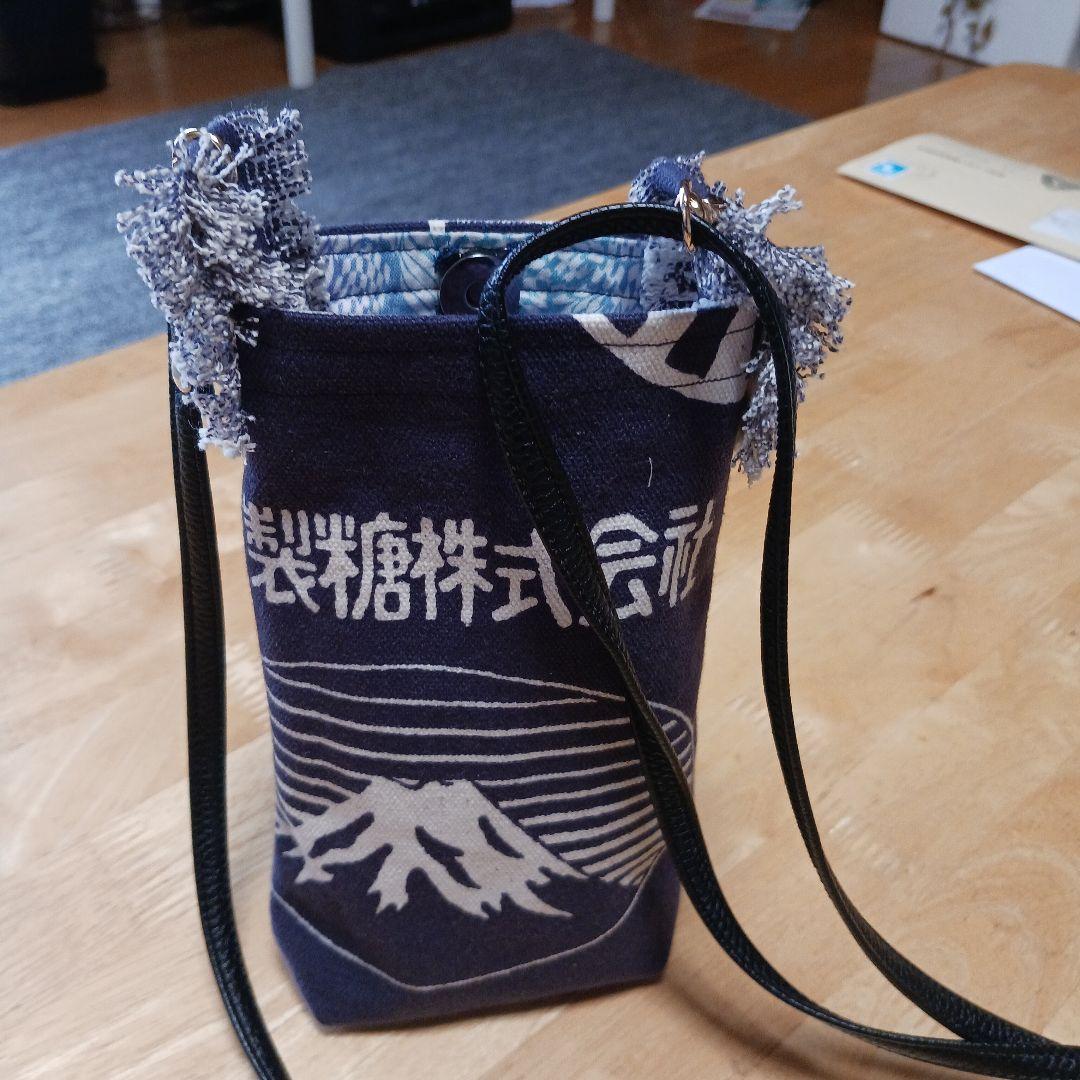 ハンドメイドの富士山と太陽のデザインが特徴的なネイビーのスマホショルダーバッグです。ハンドメイドにご理解のある方の購入を希望します。