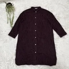 軽量ストライプ生地のフロントオープンロングワンピース、ウエストリボン付きでスタイリッシュ。