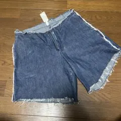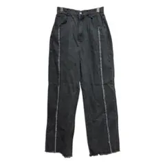 ウエスト周り、フロントポケット、バックポケットに大胆な切りっぱなし(フリンジ)加工を施した、リメイク風のデザインデニムです。