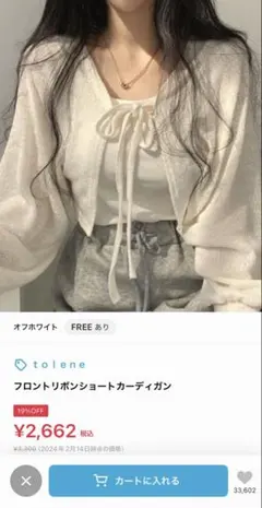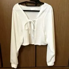 テクスチャーのあるホワイトカーディガン、リボン付きの前開きデザイン。