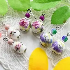 花柄の陶器ビーズのピアス3点をセットにしたハンドメイドピアスです。