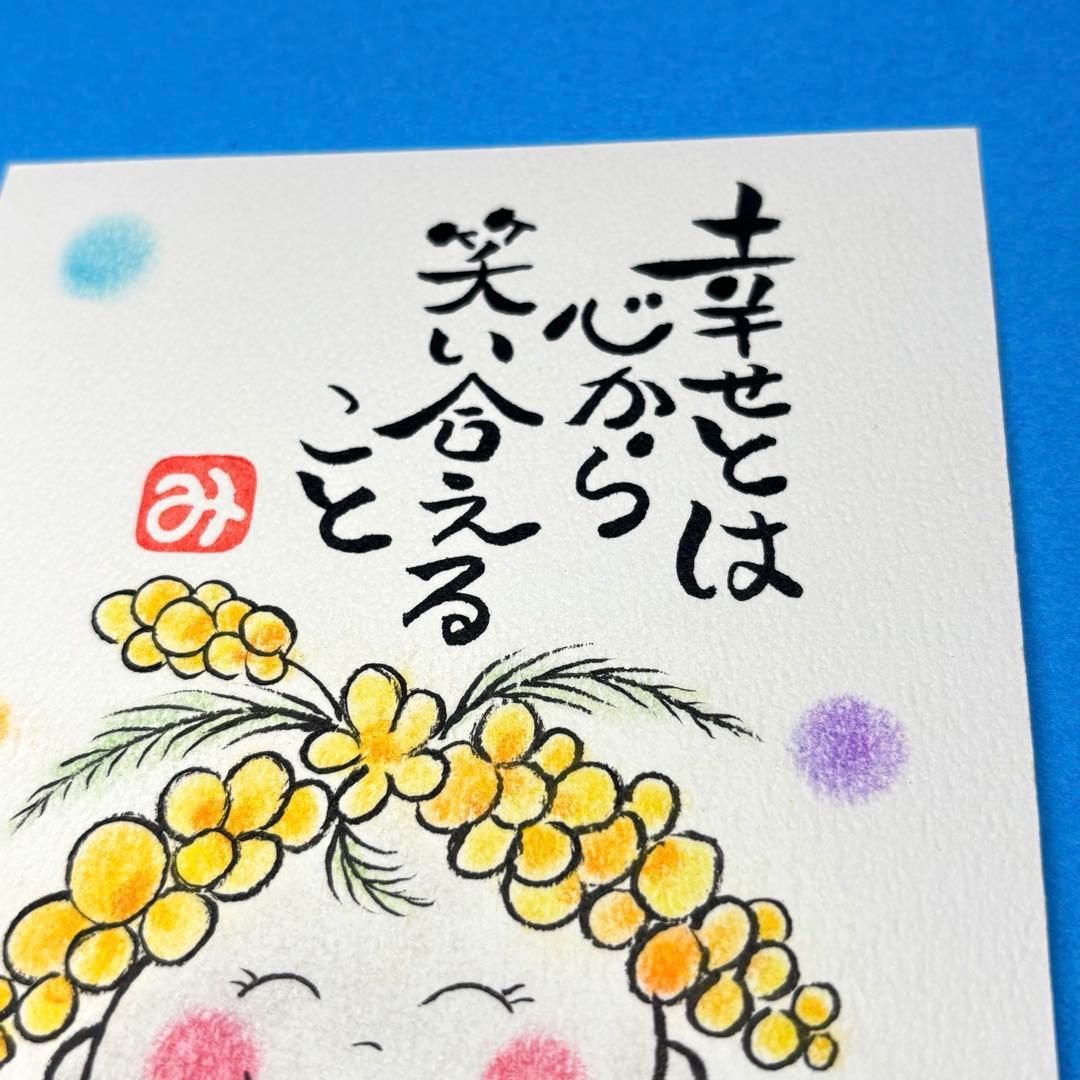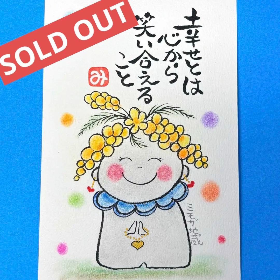 *317幸せとは&ミモザ地蔵をパステルと筆文字アートで描いてみました。ハガキサイズ厚口水彩紙です。
