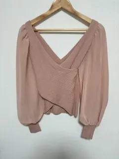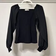七分程度のワイドスリーブて、襟元がゴム仕様になっているのでオフショルとしてもかわいく着こなせます。前にリボンで結べます。