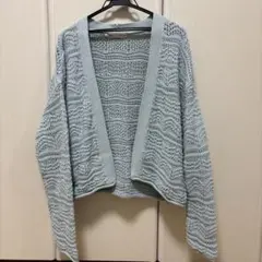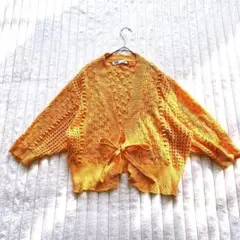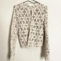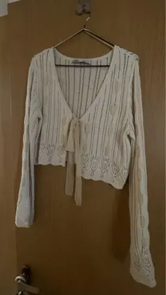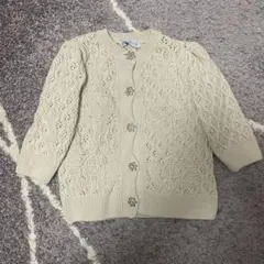 アイボリーのかぎ針レース編みクロップドカーディガン、フレア袖デザインで軽やかな印象。キラキラとしたボタンが可愛いです。