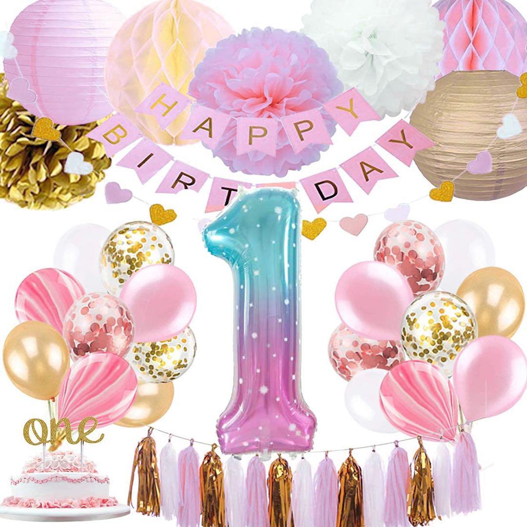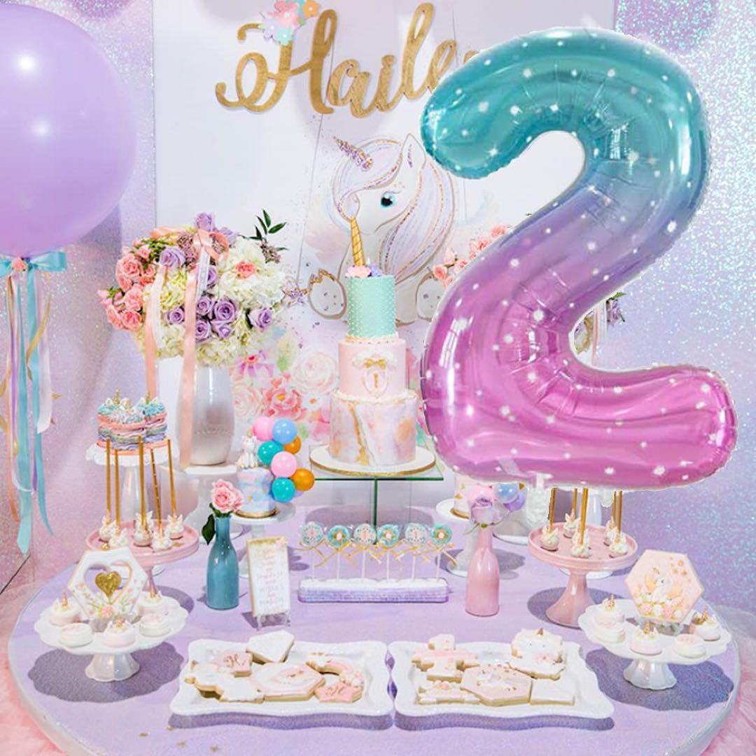 青とピンクのグラデーションの水玉模様の数字バルーン、誕生日パーティーに最適。