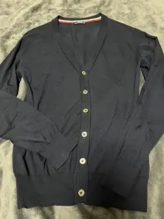 グレーのVネックカーディガン、ボタン留め、ストライプの襟デザイン。