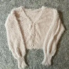 ふわふわしたオフホワイトの長袖カーディガン、パール装飾のボタン付き。