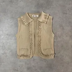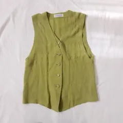 ダークブラウンのVネックノースリーブベスト、木製ボタン付き、プリーツ加工デザイン。