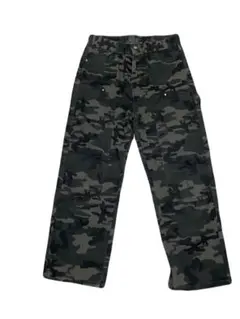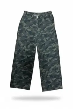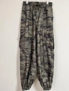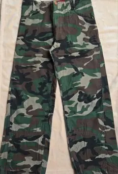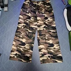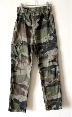 迷彩柄のカーゴパンツ、サイドポケット付きで実用的。