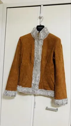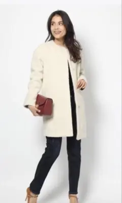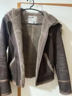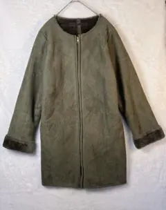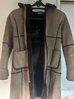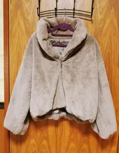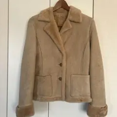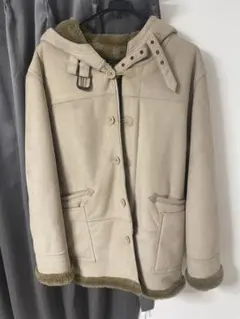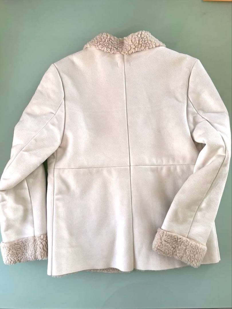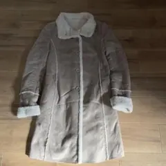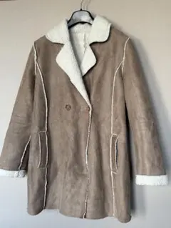 アイボリーのシープスキン風コート、ボアライニングで暖かさを提供。